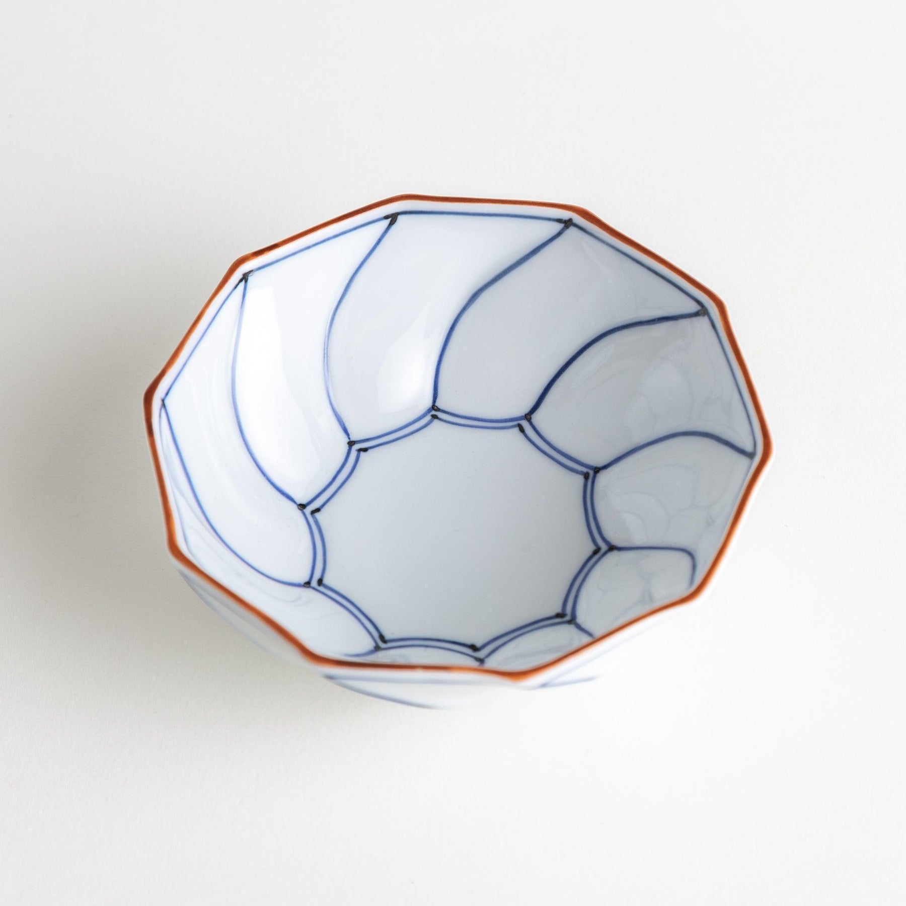 The Lined Decagon Dessert Bowl brings refined elegance to the table with its striking chrysanthemum-inspired form. Handcrafted in Hasami Ware, this porcelain piece features ten gently curving sides that echo the shape of a blossoming flower. Each facet is carefully outlined by hand in vivid red or deep blue, creating a simple yet captivating contrast against the pure white glaze.