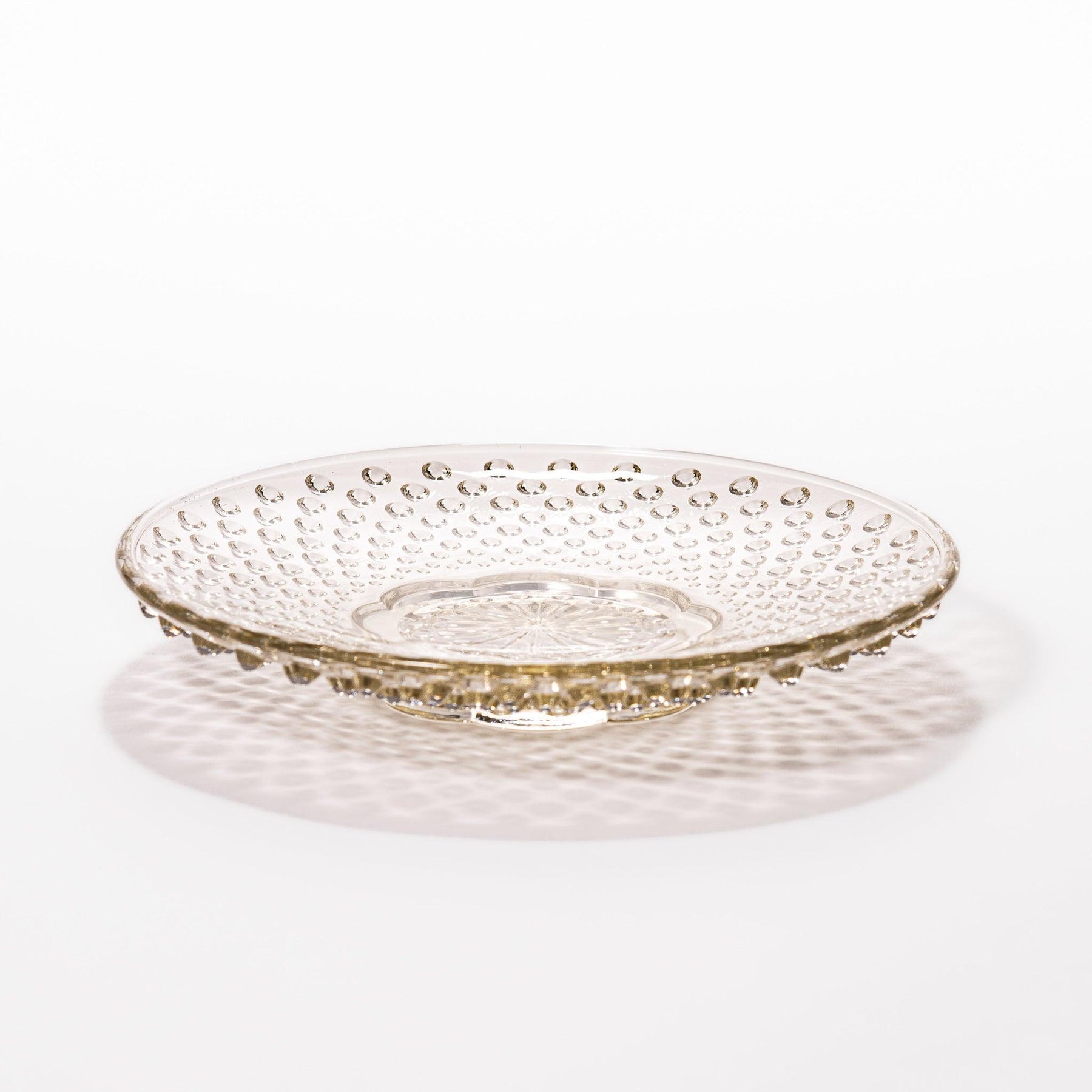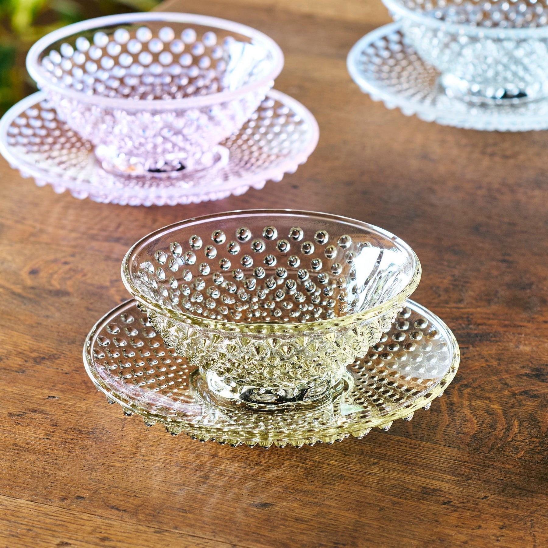 The Moonlit Arare Dessert Bowl & Saucer Set shimmers with quiet elegance, its surface patterned with raised dots that recall falling hailstones. Light dances across the glass, casting intricate reflections that change with every angle, much like moonlight over still water.