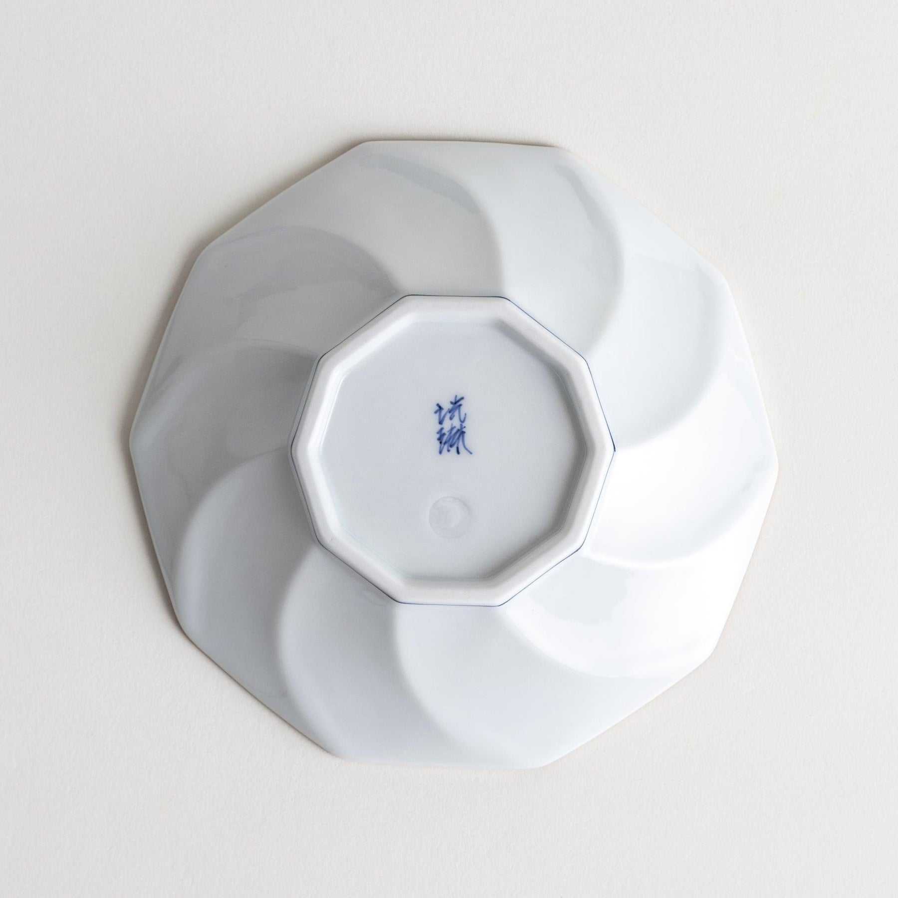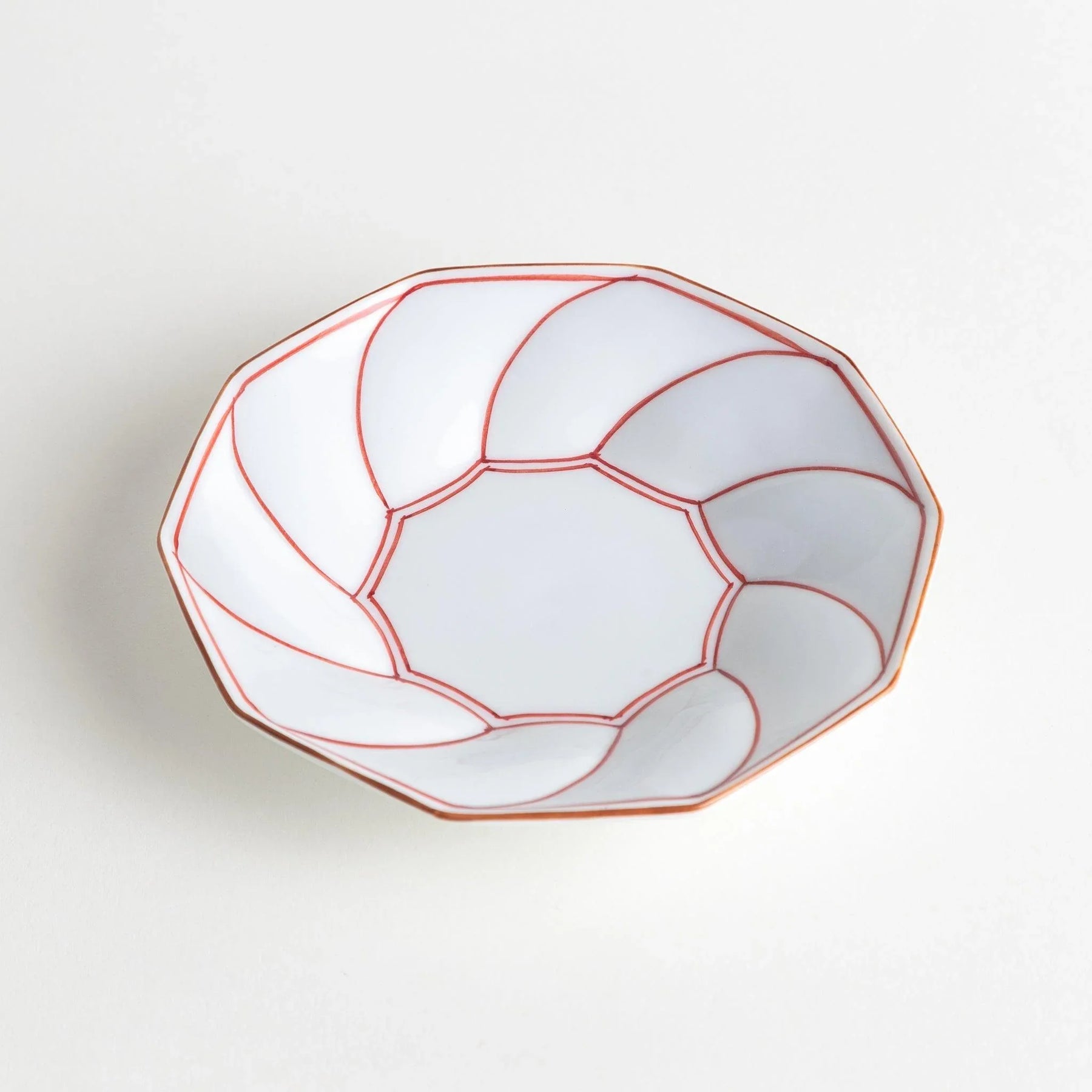 The Geometric Blossom Rimmed Dessert Plate showcases the elegance of Hasami ware through a design that feels both traditional and contemporary. The octagonal form opens into soft, petal-like curves, creating the impression of a blossoming flower. Hand-painted lines in indigo or red trace the contours, highlighting the plate’s shape with a refined yet playful touch.