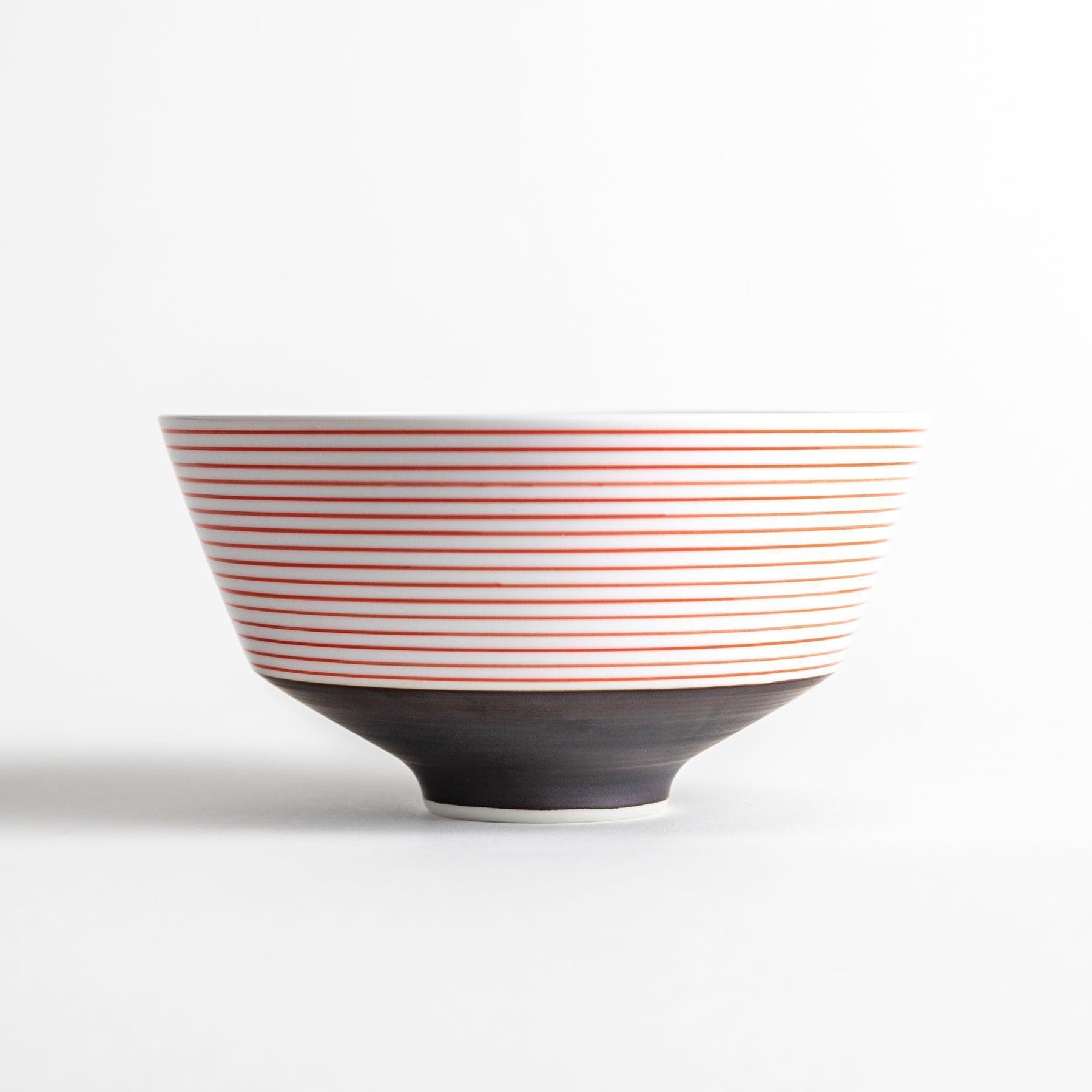 The Millennia Lines Donburi Bowl pairs a classical silhouette with a refined striped design. Made from fine Arita ware porcelain, it features soft horizontal bands in deep indigo or red, contrasted by a smooth, earthy-toned base. The result is a bowl that feels both grounded in tradition and cleanly modern.