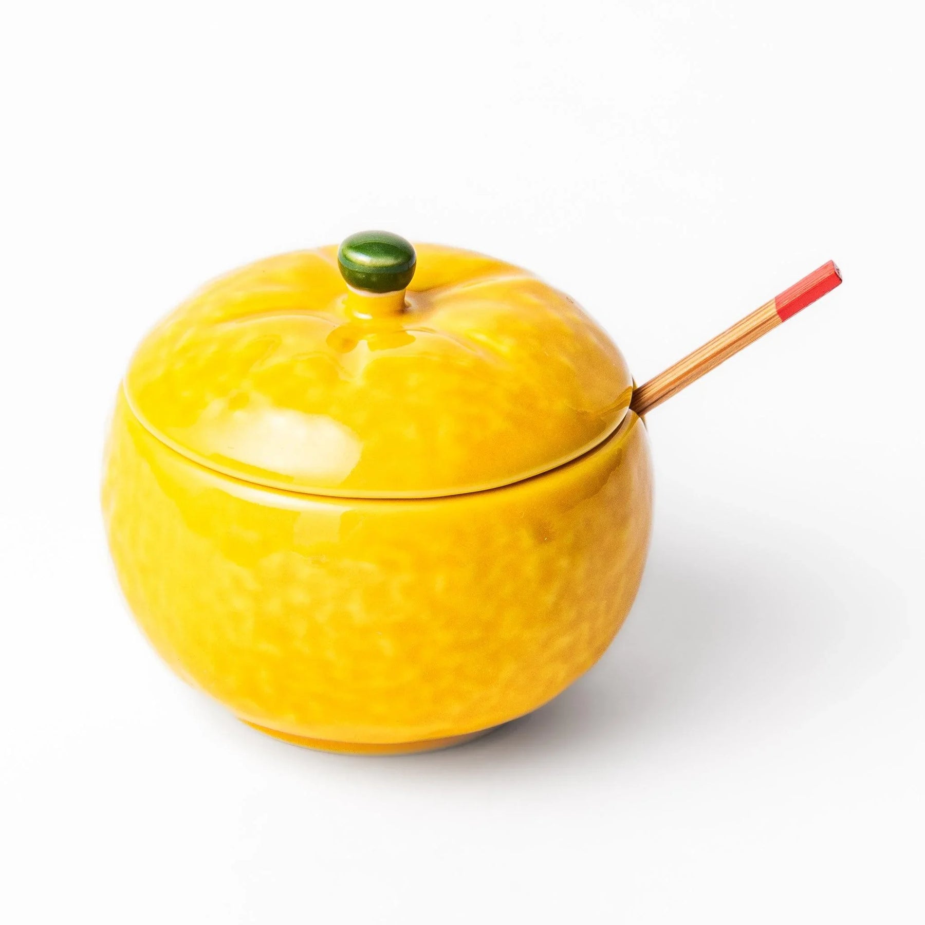 The Yuzu Condiment Bowl brings a burst of brightness to the dining table, shaped in the cheerful form of a ripe yuzu citrus. Glazed in a vivid yellow with a glossy finish, the bowl is topped with a small green knob that resembles the fruit’s stem, adding a charming detail to its playful design. The texture and color capture the lively character of the yuzu, a fruit celebrated in Japan for its refreshing fragrance and seasonal appeal.
