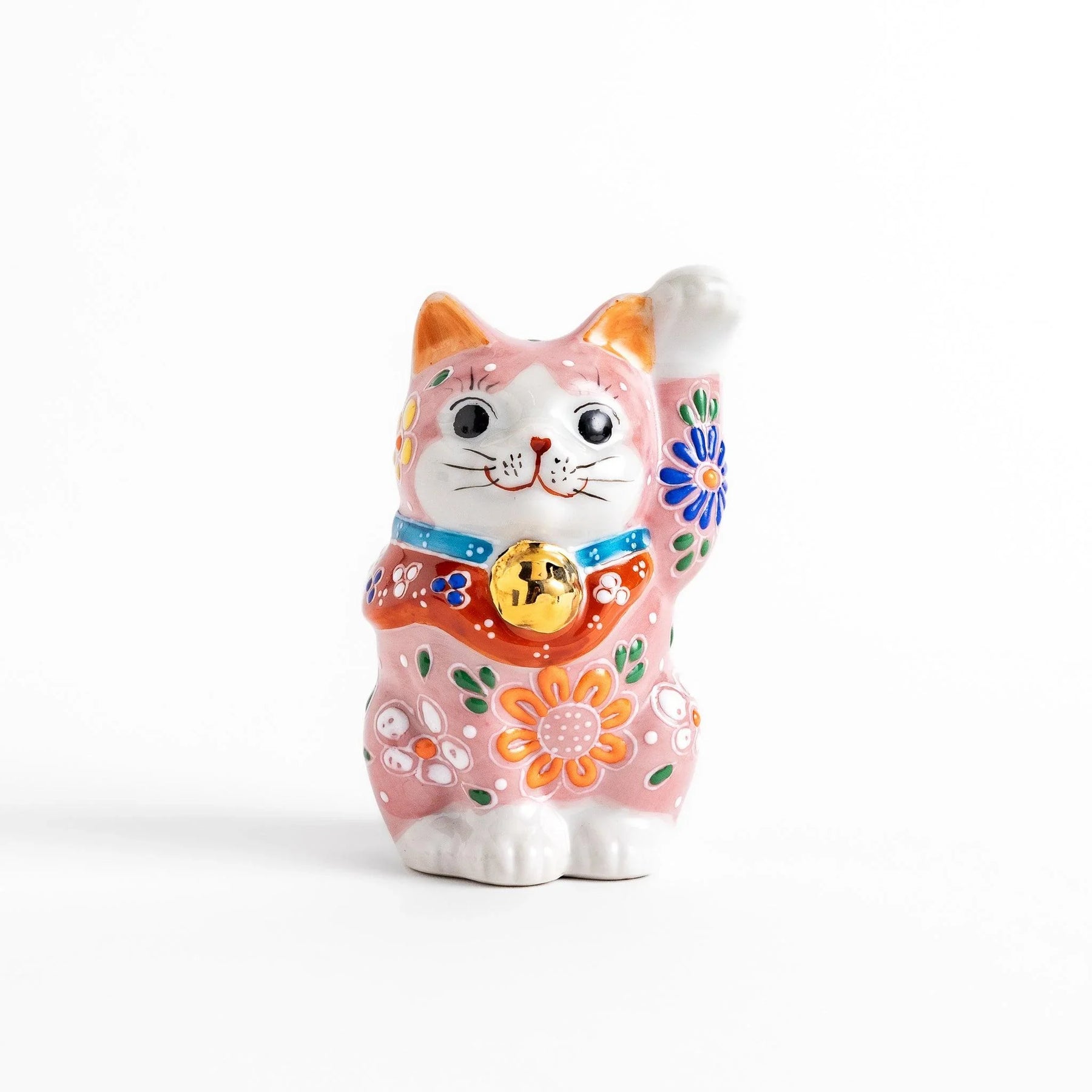 Each piece is crafted in Kutani ware, a style admired for lively brushwork, layered enamel glazes, and intricate decorative detail. The golden bell resting at its neck glimmers softly, enhancing the figure’s presence and lending elegance to its cheerful design. Together, these elements make the Maneki Neko not only a lucky figurine but also a meaningful expression of Japanese artistry.