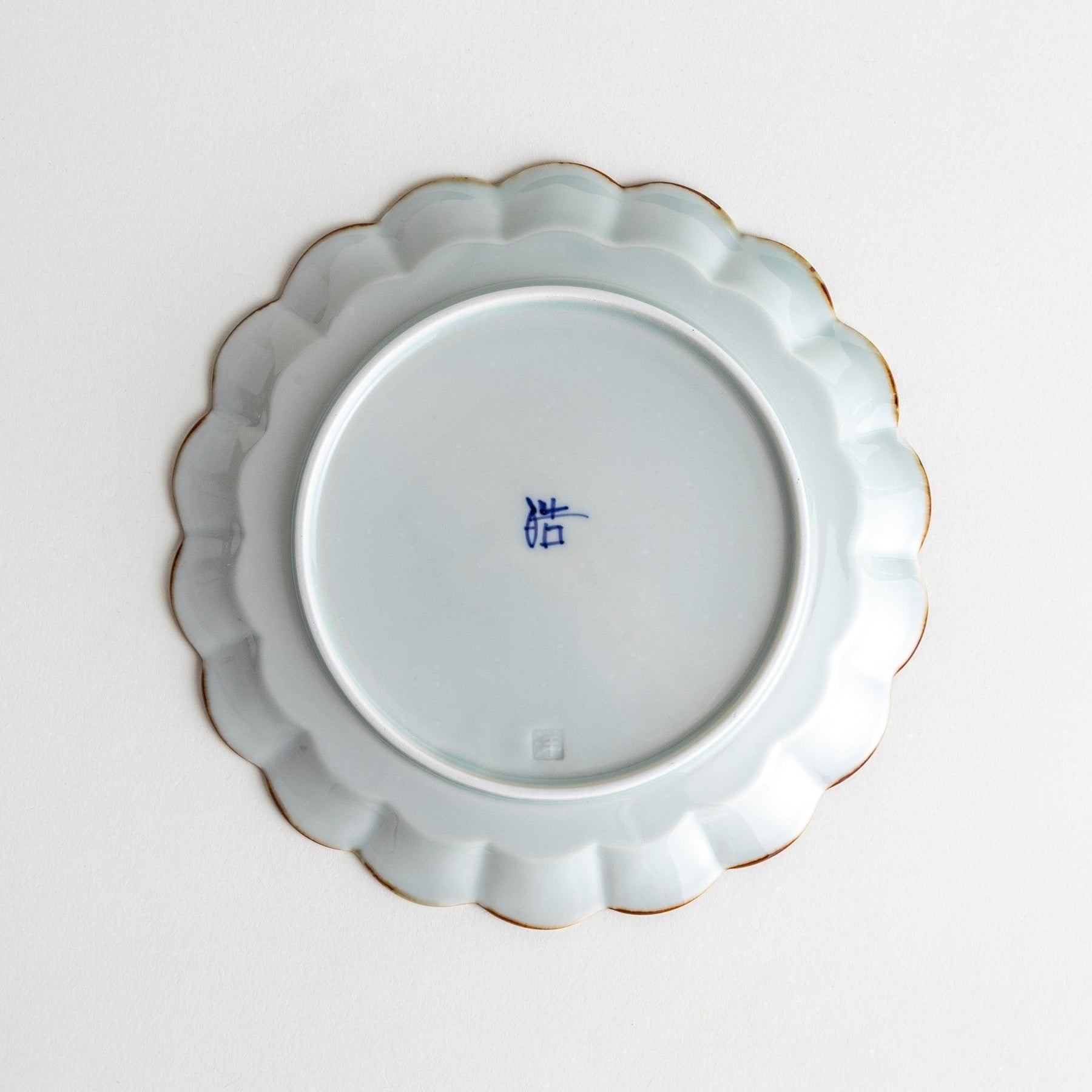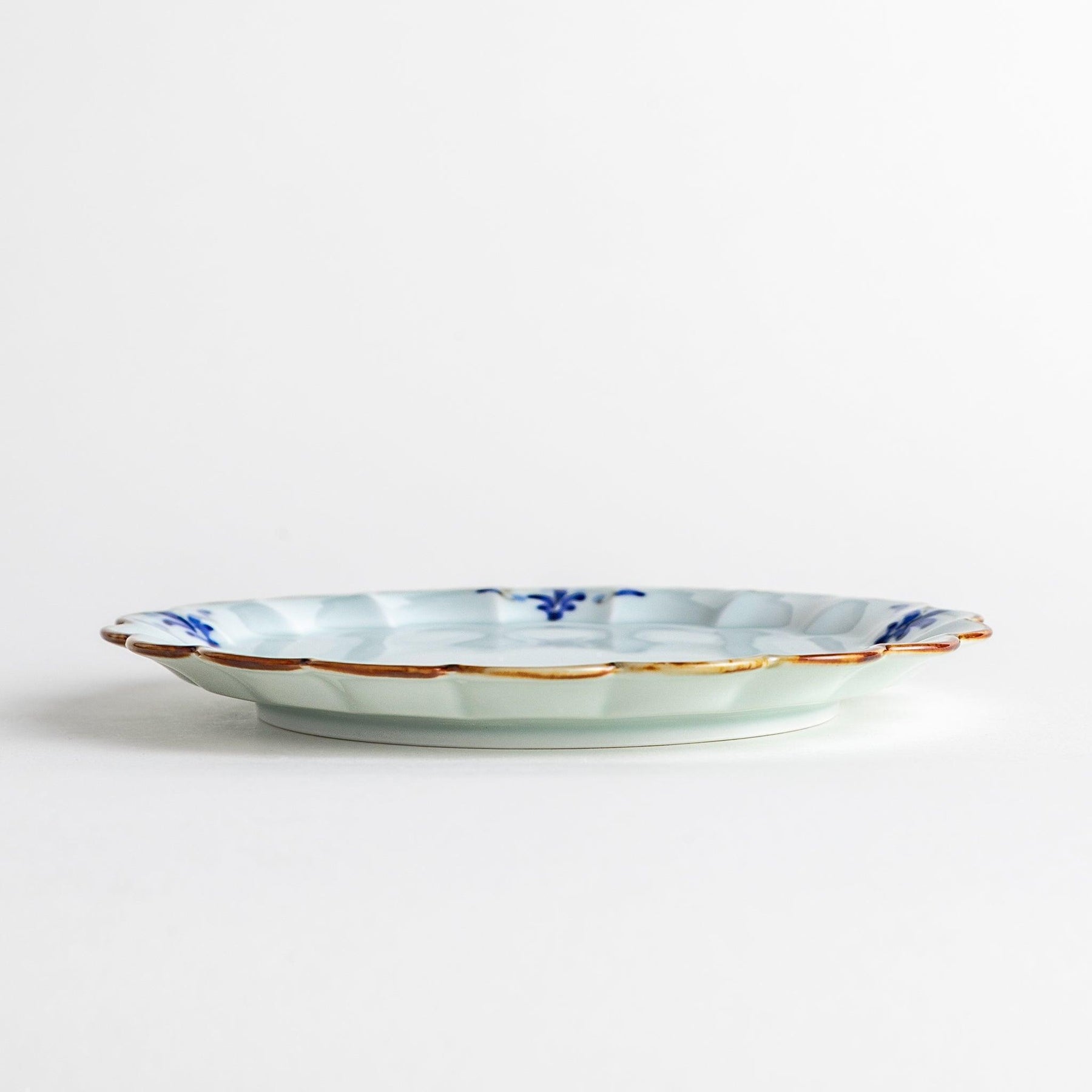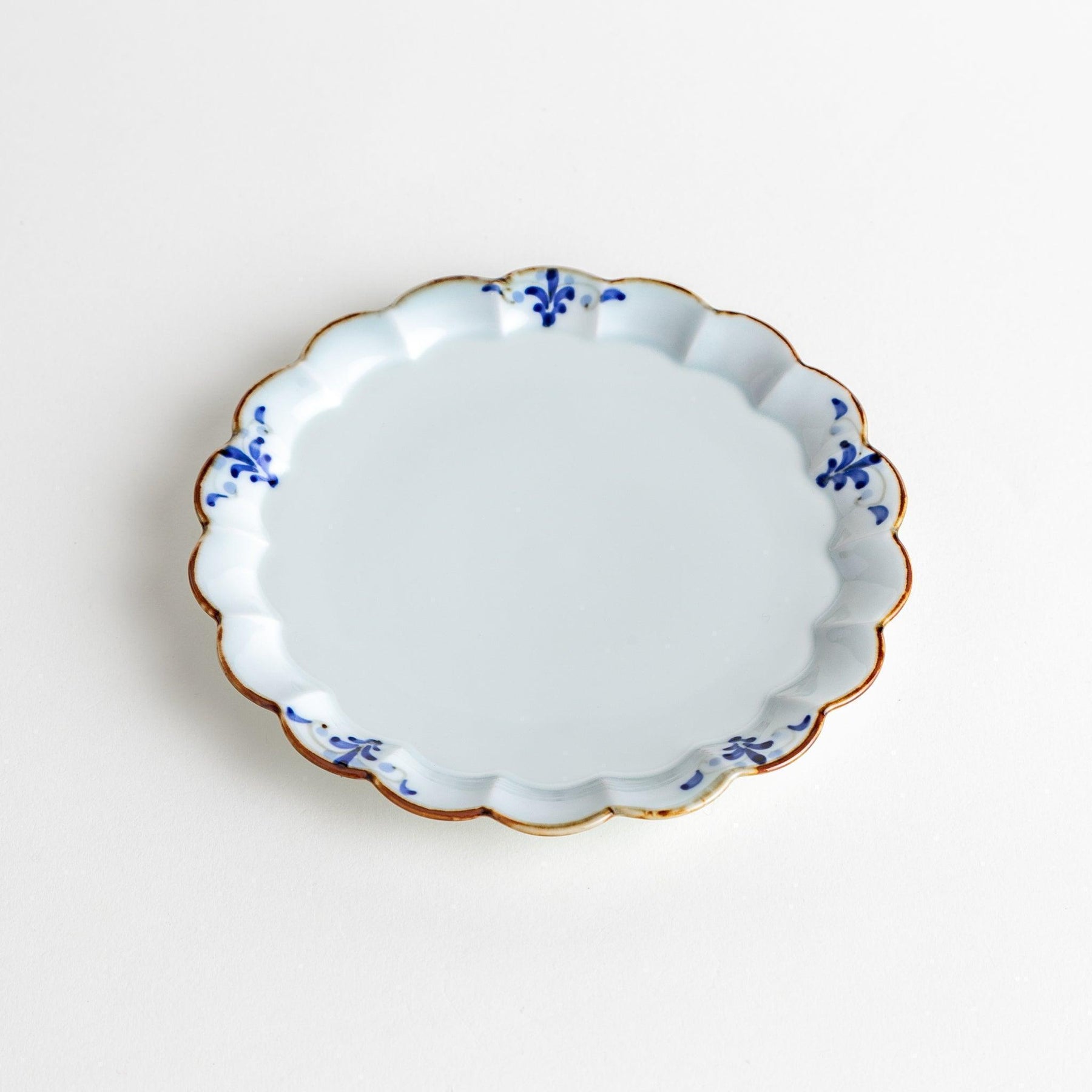 The Floral Leaves Scalloped Dessert Plate highlights the artistry of Arita ware with a design that is both refined and versatile. Its softly scalloped edges recall the form of a chrysanthemum, while delicate indigo motifs appear at intervals along the rim, creating a sense of rhythm and balance. A fine copper-gold outline completes the design, adding a subtle shimmer that enhances the clean white porcelain surface.