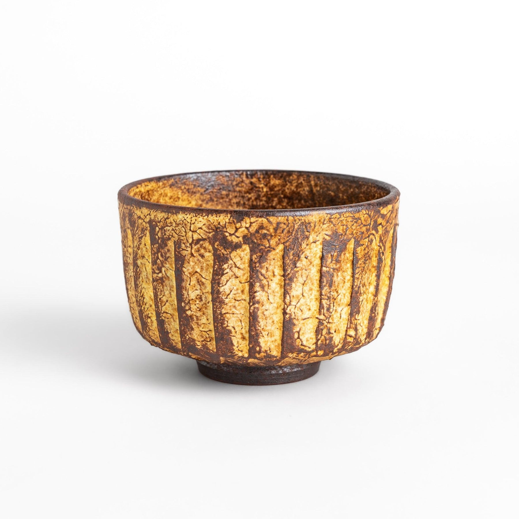 The Golden Tapestry Matcha Bowl radiates warmth through its bold glaze of golden ochre and deep bronze. Vertical facets carved into the surface catch the light in shifting tones, creating texture and depth that feel both earthy and refined. Its tactile finish invites the hands to linger, enhancing the meditative rhythm of preparing tea.