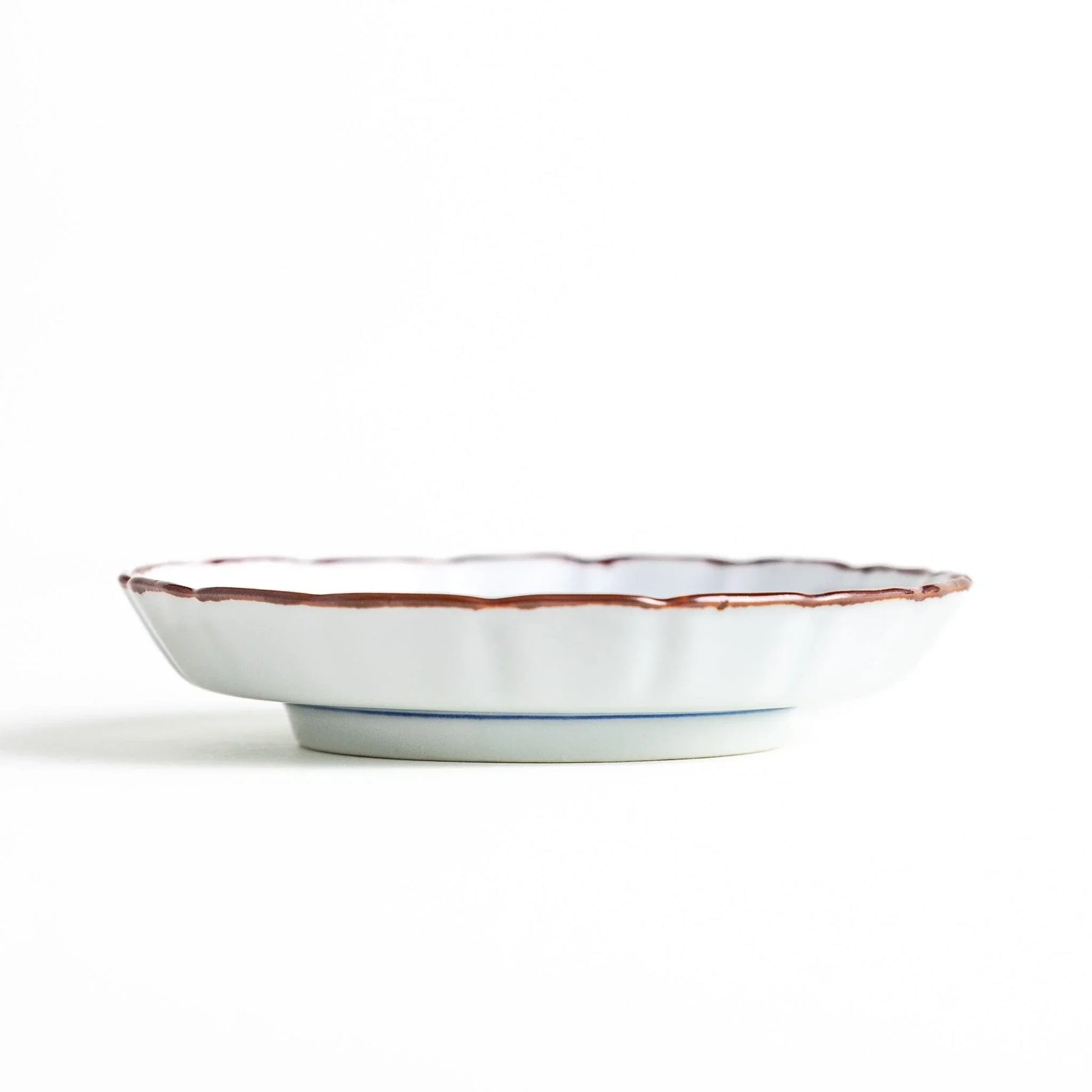 The motif highlights Mount Fuji in soft relief behind a classical pine grove, painted in a rich indigo blue that contrasts beautifully with the pure white porcelain. A brown rim accents the dish, providing definition to the form and enhancing its refined appearance. This combination of motif and detail reflects the harmony of Japanese artistry and usability. Whether placed at the center of a meal or used as an accent piece, the Blue Pine Grove Mount Fuji Raised Rim Sauce Dish blends practicality with elegance, making it a meaningful addition to any dining collection.