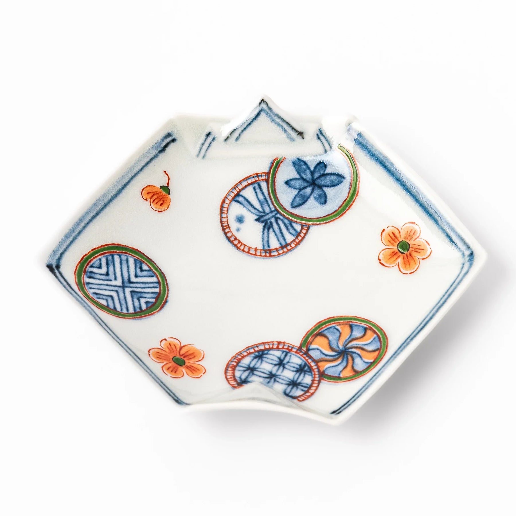 Playful yet refined, the Geometric Circle Origami Sauce Dish instantly captures attention with its origami-inspired hexagonal form. Each fold-like edge frames a lively pattern of hand-painted circles and blossoms, blending traditional Japanese motifs with a modern sense of fun. The contrast of vivid reds, blues, and greens brings energy to the table while still keeping a sense of balance and harmony.