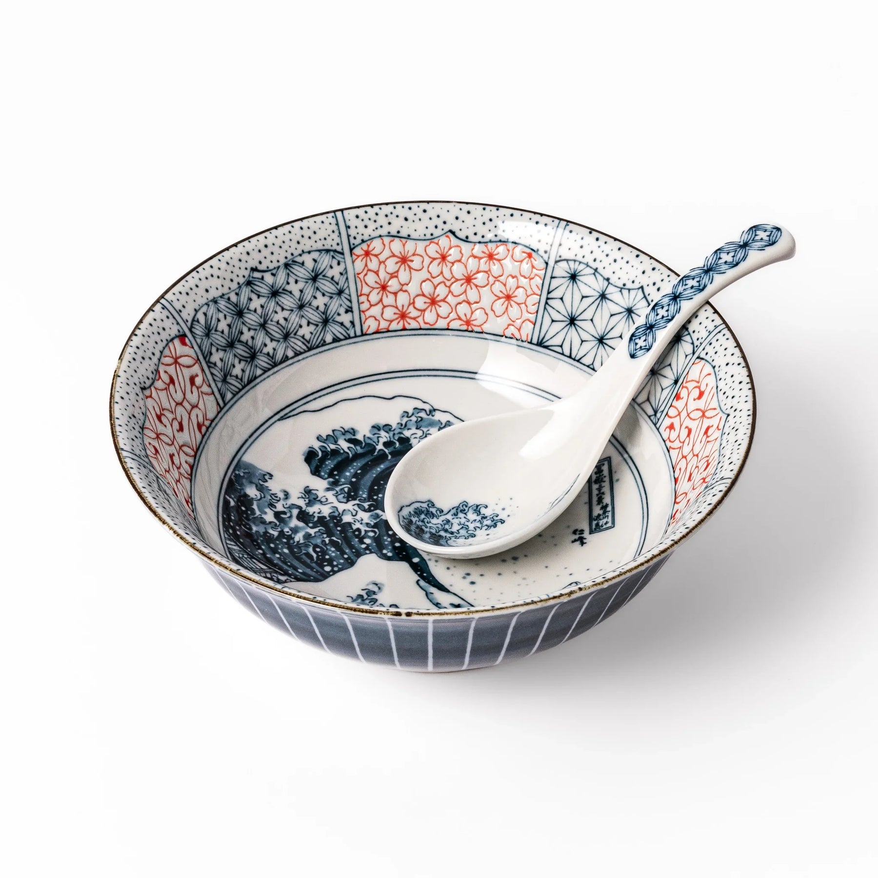 Inspired by the timeless artistry of The Great Wave off Kanagawa, the Blue Hokusai Wave Ramen Bowl brings iconic ukiyo-e design to your everyday table. Its interior features alternating panels of classic Japanese motifs—cherry blossoms, hemp leaves, and basket weave—encircling a center rendered in deep blue sometsuke glaze. The outer surface is accented with clean vertical lines for a modern yet traditional finish.