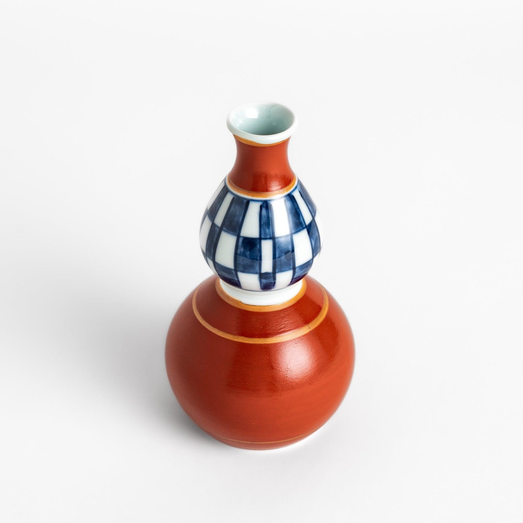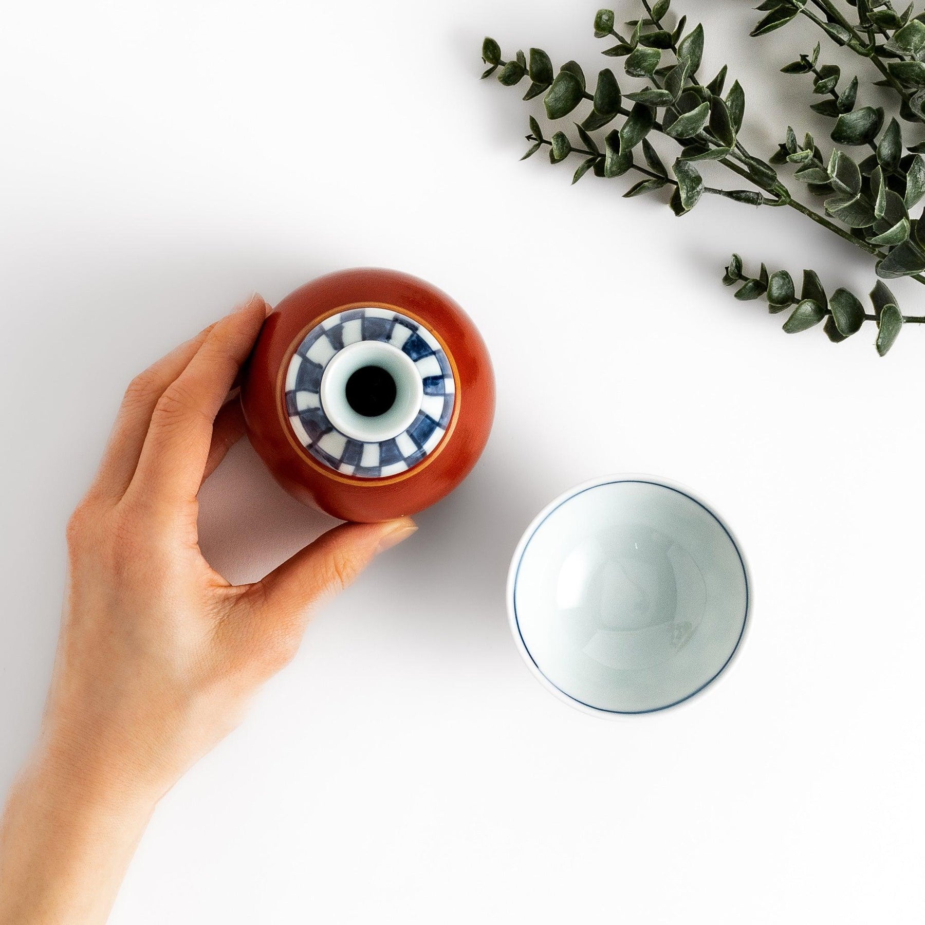 The Red Checkered Sake Set showcases the artistry of Hasami ware, uniting bold design with refined craftsmanship. The deep red surface contrasts beautifully with the indigo checkered pattern, each square carefully painted to highlight the hand of the artisan. Fine gold accents trace the edges, adding a subtle sense of elegance and distinction.