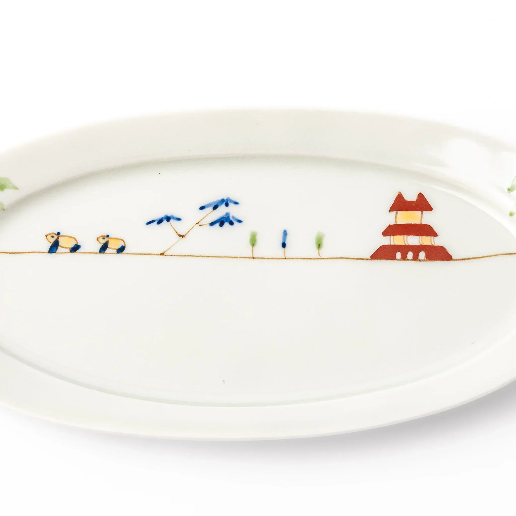 Its slim oval form offers a comfortable surface for salads, dim sum, pastries, or small shared dishes. The smooth porcelain finish keeps the illustration bright and airy, while the lightweight design makes it easy to enjoy every day. The plate adds a feeling of warmth and ease to mealtime without overwhelming the food itself.