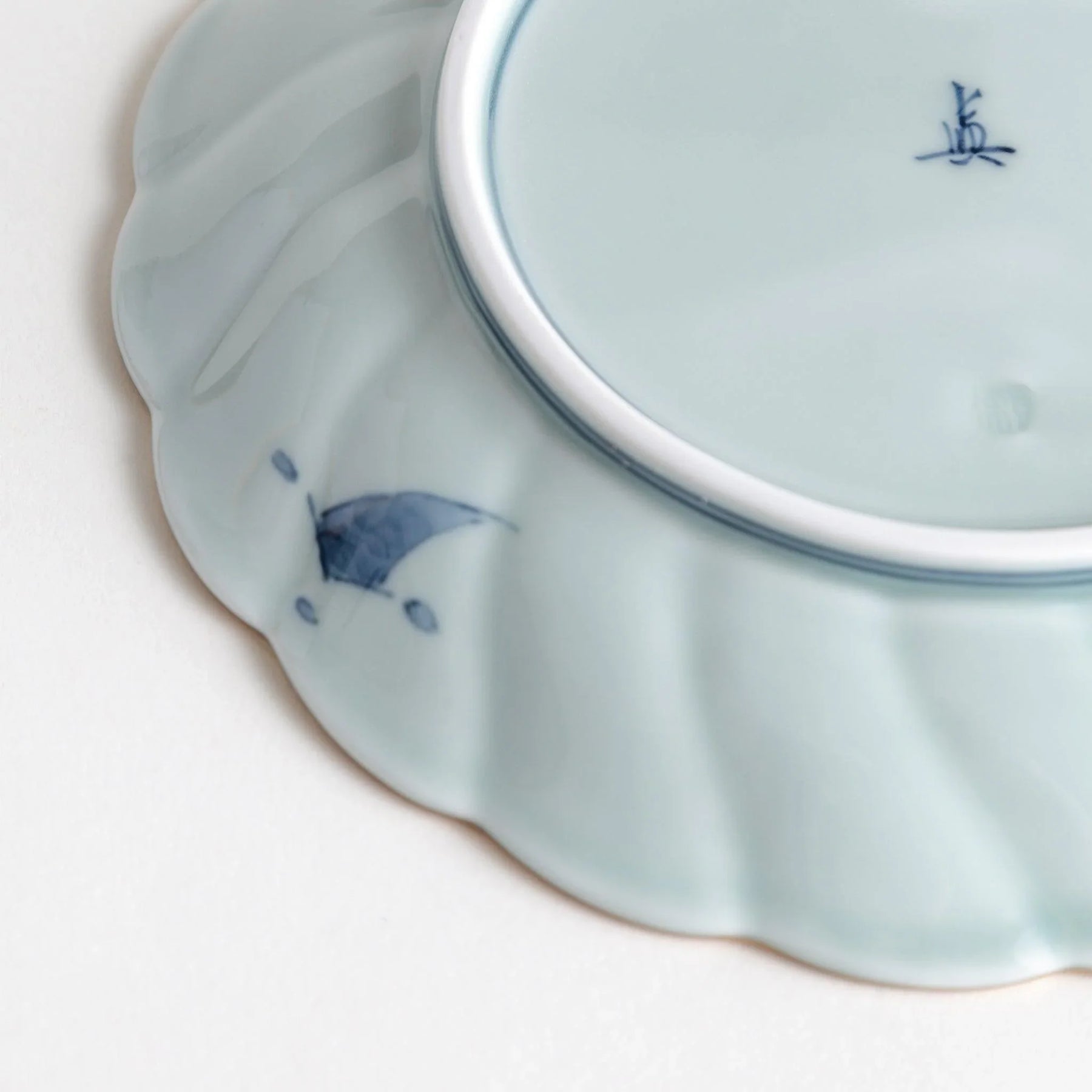 The Wisteria Flower Salad Plate highlights the elegance of Old Imari, a traditional style of Japanese porcelain celebrated for its vivid patterns and refined artistry. Its scalloped rim is finished with delicate touches of gold, framing a lively composition of deep indigo, rich red, and soft green that brings depth and brilliance to the design.