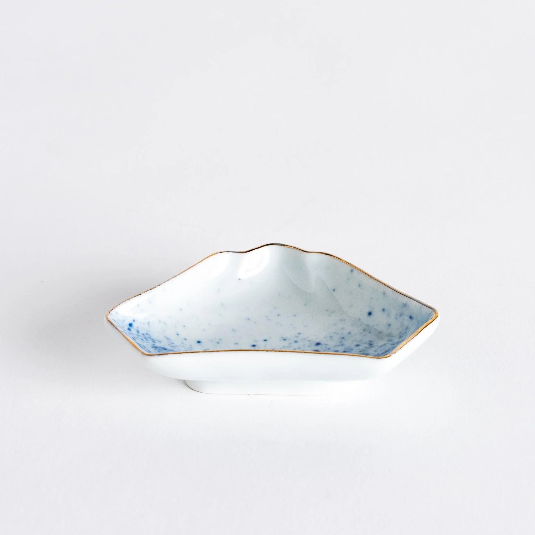 Charming and versatile, the Sprayed Ink Mount Fuji Shape Mini Sauce Dish captures Japan’s most iconic peak in a refined porcelain form. The gently curved silhouette mirrors Mount Fuji’s slopes, while a delicate gradation of indigo speckles evokes mist and shadow on the mountain’s surface. A fine copper-toned rim frames the design, adding a subtle touch of elegance.