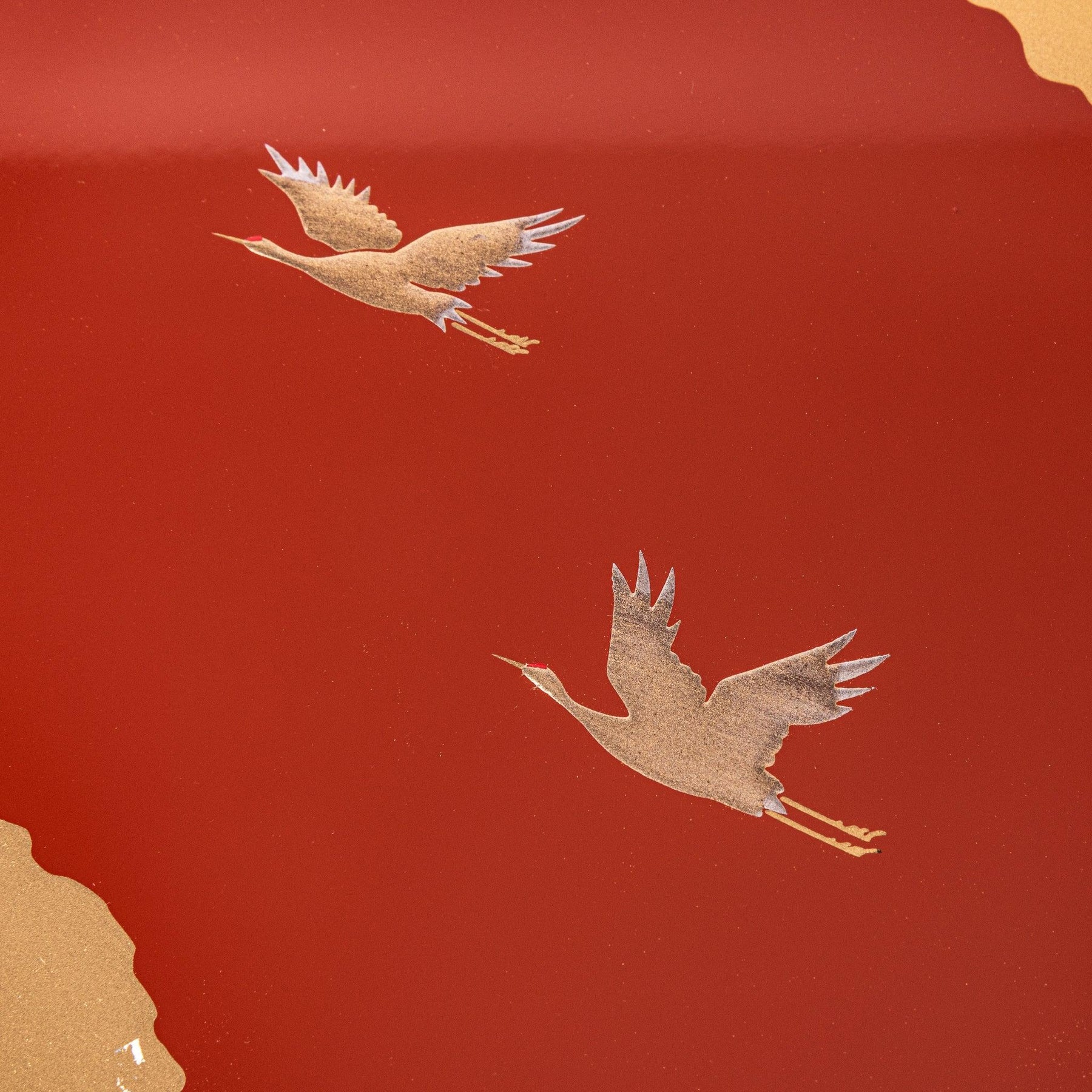 Each layer offers ample room for beautifully arranging osechi, sushi, sweets, or shared family dishes. The hand-applied design wraps continuously across both tiers, creating a sense of unity and movement. Carefully lacquered to a rich, warm red, the box combines Japanese elegance with functionality, making it a standout piece for gatherings or seasonal displays.